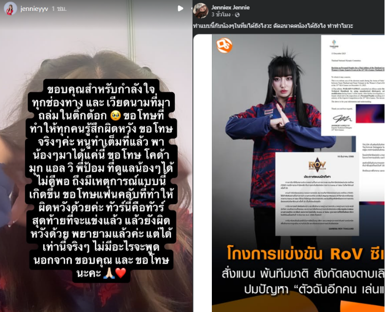 ด้าน Parichat Boonmung หรือ THA_PARICHAT นักกีฬาอีสปอร์ตทีมชาติไทย ได้โพสต์สตอรี่ผ่านอินสตาแกรม ระบุข้อความว่า ขอบคุณทุกกำลังใจจากทุกคน แล้วก็ขอโทษทุก ๆ คนด้วยคับ