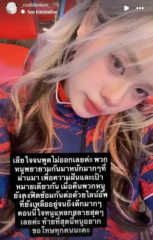 ขณะที่ Jormkon Pumseenil หรือ THA_JORMKON ได้โพสต์สตอรี่อินสตาแกรม ระบุว่า เสียใจจนพูดไม่ออกเลยค่ะ พวกหนูพยายามกันมาหนักมาก ๆ ที่ผ่านมา เพื่อความฝันและเป้าหมายเดียวกัน เมื่อคืนพวกหนูยังคงฟิตซ้อมกันต่อด้วยไลน์อัพที่ยังเหลืออยู่จนถึงดึกมาก ๆ ตอนนี้ใจหนูแหลกสลายสุด ๆ เลยค่ะ ท้ายที่สุดนี้หนูอยากขอโทษทุกคนนะคะ