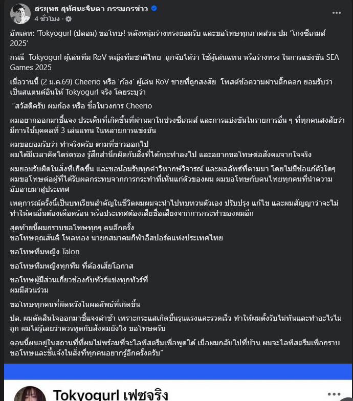 วันที่ 3 มกราคม 2569 เฟซบุ๊ก สรยุทธ สุทัศนะจินดา กรรมกรข่าว รายงานว่า กรณี Tokyogurl ผู้เล่นทีม RoV หญิงทีมชาติไทย ถูกจับได้ว่า ใช้ผู้เล่นแทน หรือร่างทรง ในการแข่งขัน SEA Games 2025 เมื่อวานนี้ (2 ม.ค.69) Cheerio หรือ ก้อง ผู้เล่น RoV ชายที่ถูกสงสัย โพสต์ข้อความผ่านติ๊กตอก ยอมรับว่า เป็นสแตนด์อินให้ Tokyogurl จริง โดยระบุว่า