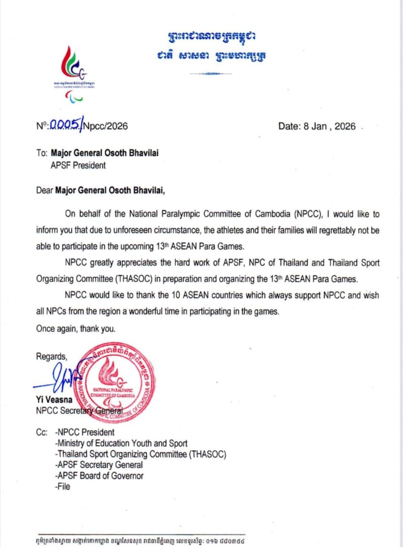 วันที่ 13 มกราคม 2569 คณะกรรมการพาราลิมปิกแห่งชาติกัมพูชา (NPCC) ได้ออกแถลงการณ์ ประกาศถอนตัวนักกีฬาทั้งหมดออกจากการแข่งขันกีฬาอาเซียนพาราเกมส์ ครั้งที่ 13 ที่กำลังจะเปิดฉากขึ้นในประเทศไทย โดยหนังสือแจ้งการถอนตัวดังกล่าวถูกส่งตรงถึง พลตรี โอสถ ภาวิไล ประธานสหพันธ์กีฬาคนพิการแห่งอาเซียน (APSF) เป็นที่เรียบร้อยแล้ว