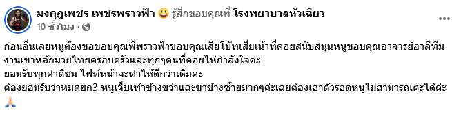ขอบคุณอาจารย์อาลี ทีมงานเขาหลักมวยไทย ครอบครัว และทุก ๆ คนที่คอยไห้กำลังใจค่ะ ยอมรับทุกคำติชม ไฟท์หน้าจะทำไห้ดีกว่าเดิมค่ะ ต้องยอมรับว่าหมดยก 3 หนูเจ็บเท้าข้างขวา และขาข้างซ้ายมาก ๆ ค่ะ เลยต้องเอาตัวรอดหนูไม่สามารถเตะได้ค่ะ