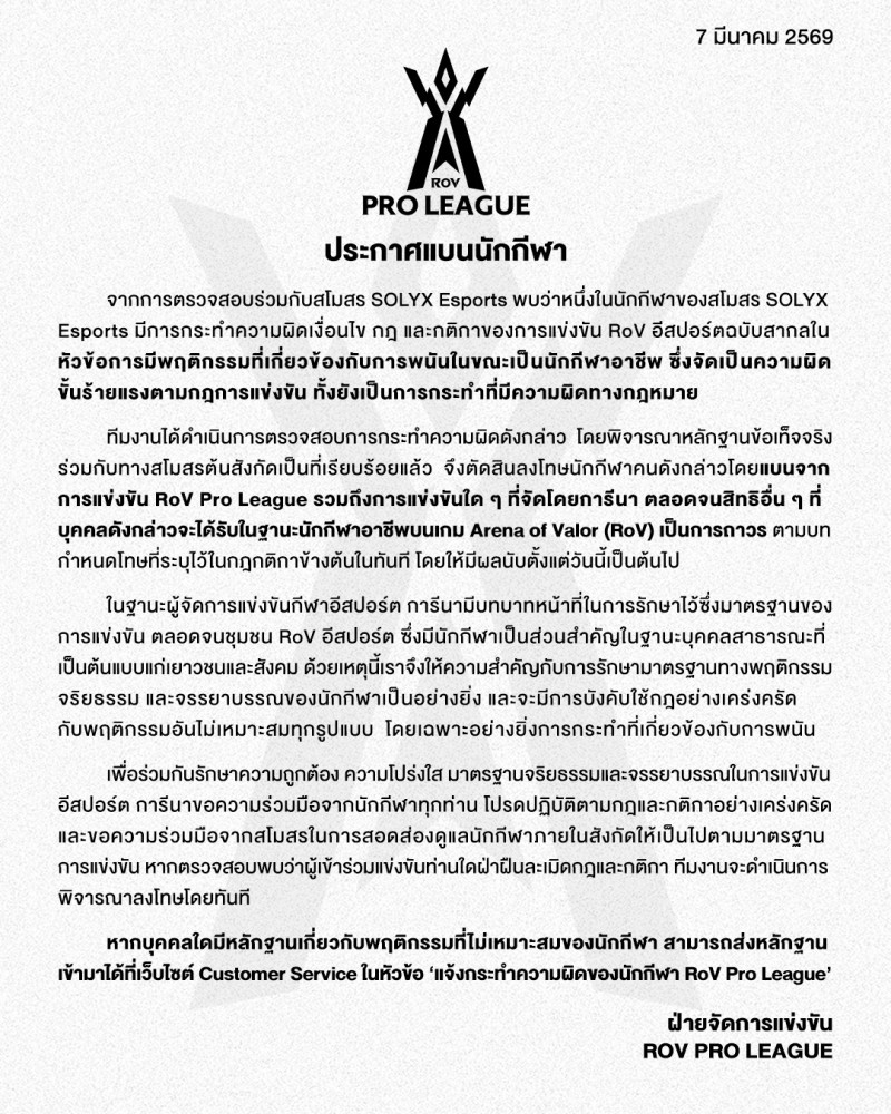 วันที่ 7 มีนาคม 2569 ทางเพจเฟซบุ๊ก Garena RoV Tournament ได้ออกแถลงการณ์ด่วนประกาศแบนนักกีฬาอีสปอร์ตเกม RoV จากสังกัดสโมสร SOLYX Esports อย่างถาวร ภายหลังจากที่ได้ตรวจสอบพบว่ามีพฤติกรรมเข้าไปเกี่ยวข้องกับการพนัน ซึ่งถือเป็นการกระทำความผิดขั้นร้ายแรงตามกฎกติกาการแข่งขันอีสปอร์ตระดับสากล
