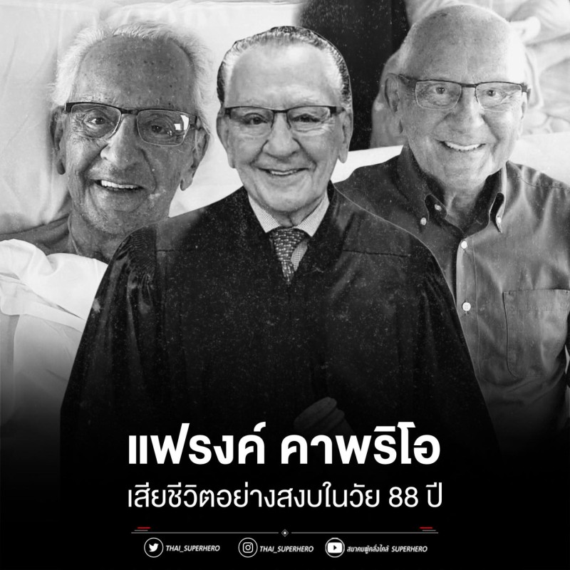 วันที่ 21 ส.ค. 2568 เพจเฟซบุ๊ก สมาคมผู้คลั่งไคล้ SuperHero ได้ออกมาโพสต์แจ้งข่าวเศร้า ระบุว่า ผู้พิพากษา แฟรงค์ คาพริโอ จากไปอย่างสงบด้วยวัย 88 ปี ส่วนสาเหตุการเสียชีวิตของเขาคือโรคมะเร็งตับอ่อน โดยแฟรงค์ คาพริโอได้ต่อสู้กับโรคร้ายมาเป็นเวลานาน ก่อนจะจากไปอย่างสงบเมื่อวันที่ 20 สิงหาคม 2025 ที่ เมืองพรอวิเดนซ์ รัฐโรดไอแลนด์ ประเทศสหรัฐอเมริกา ในวัย 88 ปี