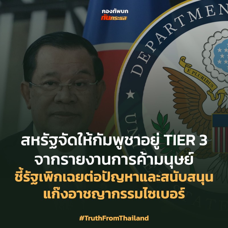 วันที่ 2 ตุลาคม 2568 เพจ กองทัพบก ทันกระแส รายงานว่า กัมพูชาถูกจัดให้อยู่ใน Tier 3 ของรายงานการค้ามนุษย์ประจำปี 2025 ของสหรัฐฯ ซึ่งสะท้อนถึงความล้มเหลวในการแก้ปัญหาการค้ามนุษย์