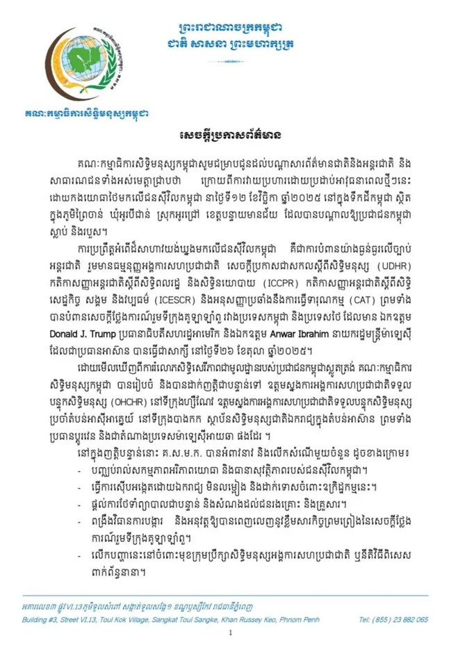 CHRC ยืนยันถึงความมุ่งมั่นอย่างแน่วแน่ของกัมพูชาต่อหลักการของกฎหมายสิทธิมนุษยชนระหว่างประเทศ และเรียกร้องให้ชุมชนระหว่างประเทศต้องรับผิดชอบอย่างเต็มที่ต่อการละเมิดร้ายแรงเหล่านี้ และดำเนินมาตรการเร่งด่วนเพื่อรับรองความยุติธรรมให้กับเหยื่อและการคุ้มครองพลเรือนทั้งหมดตามแนวชายแดนกัมพูชา-ไทย