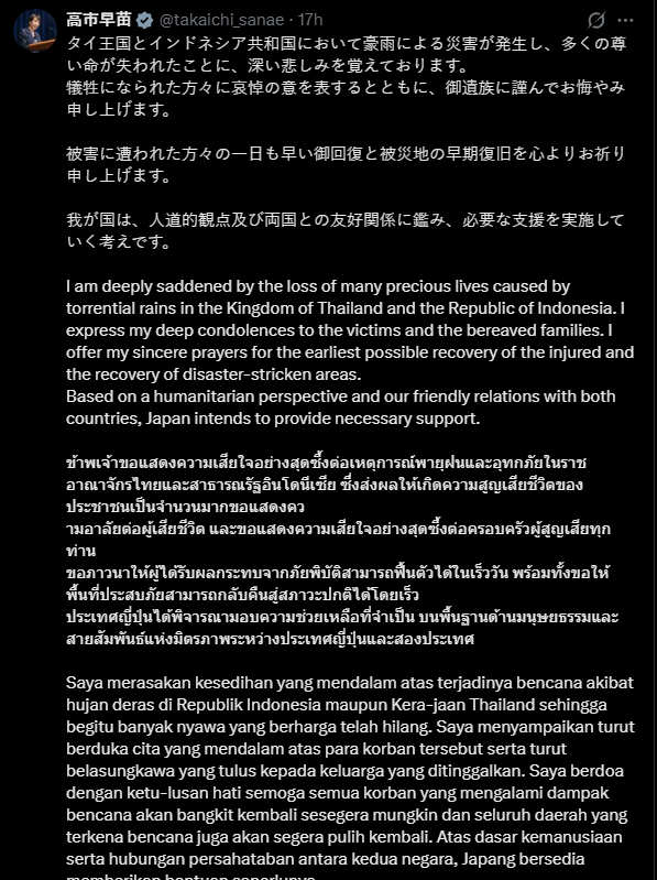 วันที่ 1 ธันวาคม 2568 นางซานาเอะ ทากาอิจิ นายกรัฐมนตรีญี่ปุ่น ได้โพสต์ทวิตเตอร์ X ถึงเรื่องเหตุการณ์อุทกภัยที่เกิดขึ้นในประเทศไทยและประเทศอินโดนีเซีย ระบุว่า