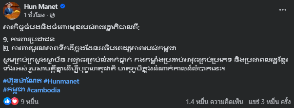 เมื่อวันที่ 8 ธันวาคม 2568 ฮุน มาเนต นายกรัฐมนตรีกัมพูชาคนปัจจุบัน ได้โพสต์ผ่านเฟซบุ๊กส่วนตัว Hun Manet ระบุว่า