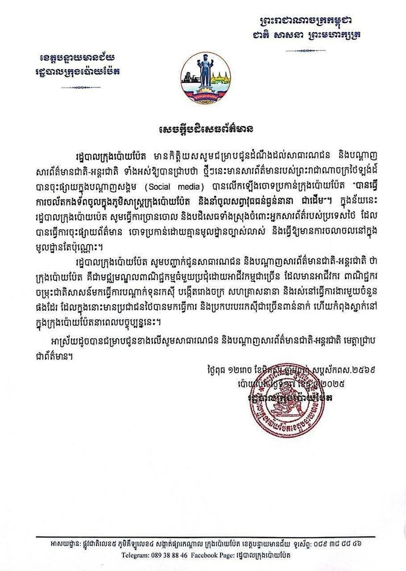 เนื่องจากเมื่อเร็ว ๆ นี้ ได้มีข่าวสารจากสื่อของประเทศไทยเผยแพร่ผ่านสื่อสังคมออนไลน์ โดยมีการกล่าวหาว่ากรุงปอยเปตมีการเคลื่อนย้ายกำลังทหารเข้ามาในพื้นที่ รวมถึงการนำอาวุธหนักเข้ามาประจำการ ซึ่งข้อมูลดังกล่าว ไม่เป็นความจริง เทศบาลกรุงปอยเปตขอปฏิเสธข่าวและข้อกล่าวหาทั้งหมดโดยสิ้นเชิง โดยเฉพาะข่าวสารจากสื่อของประเทศไทยที่มีการนำเสนอข้อมูลโดยปราศจากหลักฐานที่ชัดเจน อันอาจก่อให้เกิดความเข้าใจผิดและความไม่สงบในพื้นที่