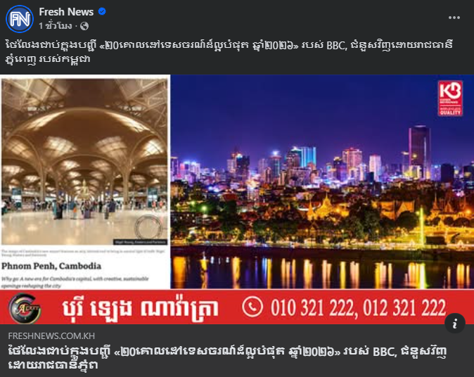 เมื่อวันที่ 2 มกราคม 2569 สำนักข่าว Fresh News ของกัมพูชา รายงานและขยายประเด็นข่าวจากสำนักข่าวบีบีซีของสหราชอาณาจักร สร้างกระแสถกเถียงในภูมิภาค หลังเผยรายชื่อ 20 สถานที่ท่องเที่ยวยอดนิยมประจำปี 2026 โดยไม่มีชื่อประเทศไทยติดอันดับ ขณะที่กรุงพนมเปญ เมืองหลวงของกัมพูชา กลับถูกจัดอยู่ในลิสต์ดังกล่าว