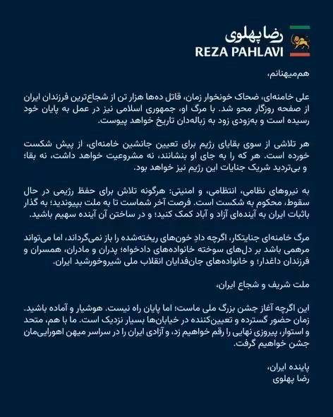วันที่ 1 มีนาคม 2569 เรซา ปาห์ลาวี มกุฎราชกุมารแห่งอิหร่าน โพสต์ข้อความผ่านช่องทางสื่อสารของตน แสดงความยินดี ต่อข่าวการเสียชีวิตของ อยาตอลเลาะห์ อาลี คาเมเนอี ผู้นำสูงสุดอิหร่าน จากเหตุการณ์โจมตีที่เกี่ยวข้องกับสหรัฐฯ และอิสราเอล