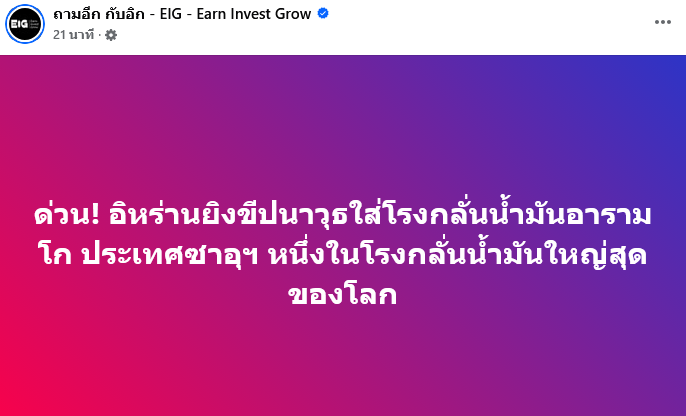 ล่าสุดเกิดเหตุการณ์สะเทือนตลาดน้ำมัน เมื่อมีรายงานด่วนจากเพจเฟซบุ๊ก ถามอีก กับอิก - EIG - Earn Invest Grow ว่า อิหร่านได้ยิงขีปนาวุธโจมตีโรงกลั่นน้ำมันของอารามโก (Saudi Aramco) ในซาอุดีอาระเบีย ซึ่งถือเป็นหนึ่งในโรงกลั่นน้ำมันขนาดใหญ่ที่สุดของโลก