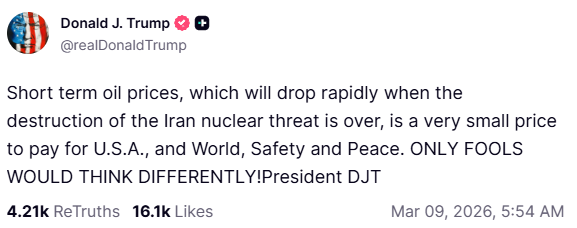 โดย ทรัมป์ ได้ระบุข้อความอย่างชัดเจนว่า ราคาน้ำมันจะกลับสู่ปกติเอง หลังภัยคุกคามนิวเคลียร์จากอิหร่านหมดสิ้น ชี้เป็นราคาเล็กน้อยที่ต้องจ่าย แลกกับความมั่นคงของโลก ใครคิดต่างคือคนโง่!