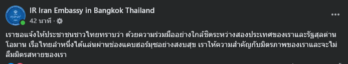 เราขอแจ้งให้ประชาชนชาวไทยทราบว่า ด้วยความร่วมมืออย่างใกล้ชิดระหว่างสองประเทศของเราและรัฐสุลต่านโอมาน เรือไทยลำหนึ่งได้แล่นผ่านช่องแคบฮอร์มุซอย่างสงบสุข เราให้ความสำคัญกับมิตรภาพของเราและจะไม่ลืมมิตรสหายของเรา