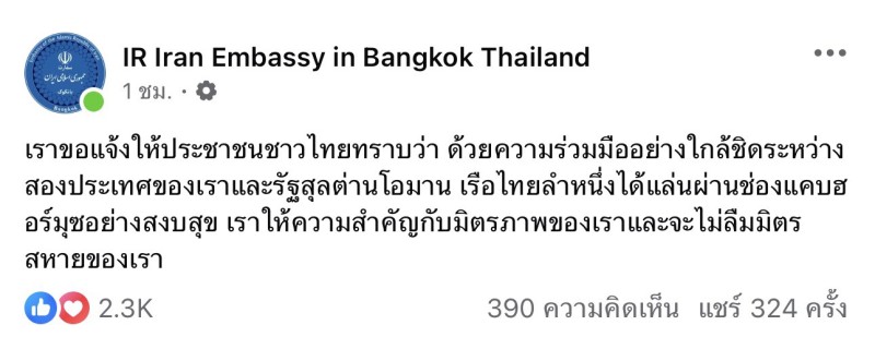 โดยระบุว่า เราขอแจ้งให้ประชาชนชาวไทยทราบว่า ด้วยความร่วมมืออย่างใกล้ชิดระหว่างสองประเทศของเราและรัฐสุลต่านโอมาน เรือไทยลำหนึ่งได้แล่นผ่านช่องแคบฮอร์มุซอย่างสงบสุข เราให้ความสำคัญกับมิตรภาพของเราและจะไม่ลืมมิตรสหายของเรา