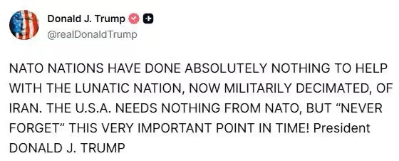 ทรัมป์ระบุว่า นาโต ไม่ได้ทำอะไรเลย เพื่อจัดการประเทศบ้าคลั่งอย่างอิหร่าน ซึ่งตอนนี้ถูกทำลายทางทหารไปแล้ว
