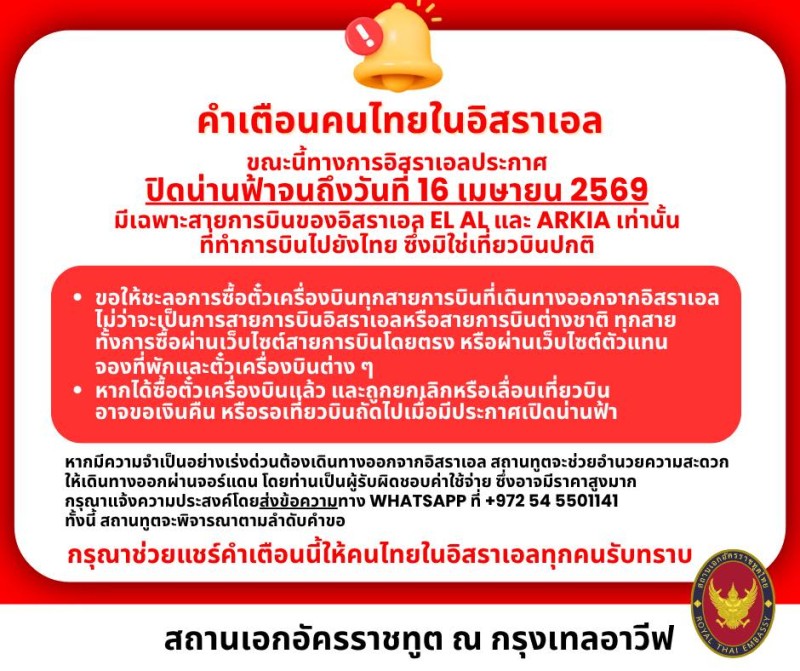 วันที่ 30 มีนาคม 2569 มีรายงานว่า สถานเอกอัครราชทูตไทย ณ กรุงเทลอาวีฟ ออกประกาศเตือนคนไทยในอิสราเอล โดยระบุว่า ขณะนี้ทางการอิสราเอลประกาศปิดน่านฟ้าถึง 16 เมษายน 2569 มีเฉพาะสายการบินของอิสราเอล EL AL, และ ARKIA เท่านัน ที่ทำการบินไปยังไทย ซึ่งมิใช่เที่ยวบินปกติ