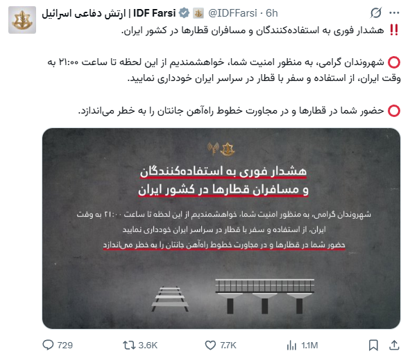 7 เมษายน 2569 กองทัพอิสราเอลออกประกาศเตือนประชาชนในอิหร่านให้หลีกเลี่ยงการใช้บริการรถไฟและออกห่างจากทางรถไฟทั่วประเทศโดยทันที หลังประเมินว่าอาจเกิดอันตรายร้ายแรงต่อชีวิต ท่ามกลางสถานการณ์สงครามที่ยังคงทวีความตึงเครียด
