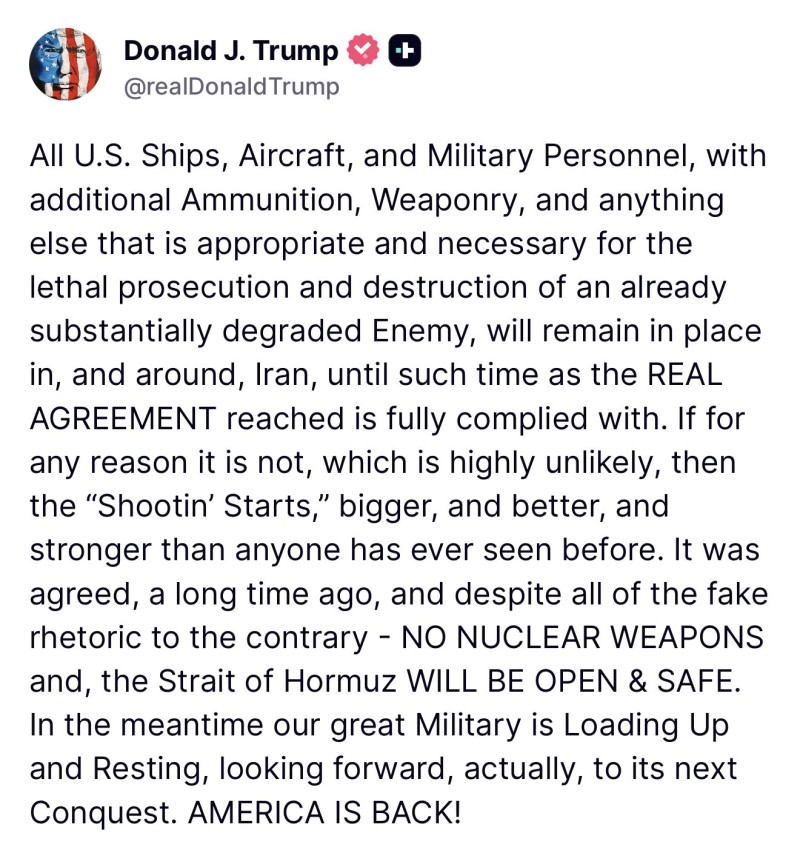 ขณะเดียวกัน ทรัมป์ย้ำว่า อิหร่านจะต้อง ไม่มีอาวุธนิวเคลียร์ ขณะที่จะต้องเปิดให้มีการสัญจรในช่องแคบฮอร์มุซอย่างปลอดภัย และทิ้งท้ายว่า ในระหว่างนี้ กองทัพที่ยิ่งใหญ่ของเรากำลังเตรียมสรรพกำลังและพักผ่อนเพื่อรอคอย ชัยชนะ ครั้งต่อไป อเมริกากลับมาแล้ว