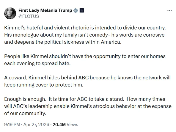 ด้านเมลาเนียตอบโต้ว่า มุกดังกล่าวไม่ใช่เรื่องตลก แต่เป็นถ้อยคำที่เต็มไปด้วยการเสียดสีและสะท้อนความขัดแย้งทางการเมืองในสหรัฐ พร้อมทั้งวิจารณ์ว่าคิมเมลหลบอยู่หลังสถานี และเชื่อว่าทาง ABC จะยังคงให้การปกป้องต่อไป