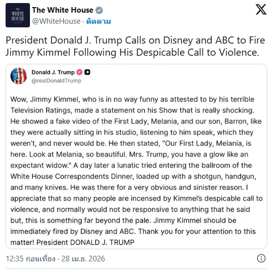 สำนักข่าวต่างประเทศรายงานจากกรุงวอชิงตัน ประเทศสหรัฐอเมริกา เมื่อวันที่ 28 เม.ย. ว่า โดนัลด์ ทรัมป์ ประธานาธิบดีสหรัฐ โพสต์ข้อความผ่านแพลตฟอร์ม Truth Social เรียกร้องให้สถานีโทรทัศน์ ABC แสดงจุดยืนอย่างชัดเจนต่อ จิมมี คิมเมล พิธีกรรายการทอล์กโชว์ชื่อดัง หลังมีการเล่นมุกตลกที่ถูกมองว่า “เกินขอบเขตอย่างมาก”