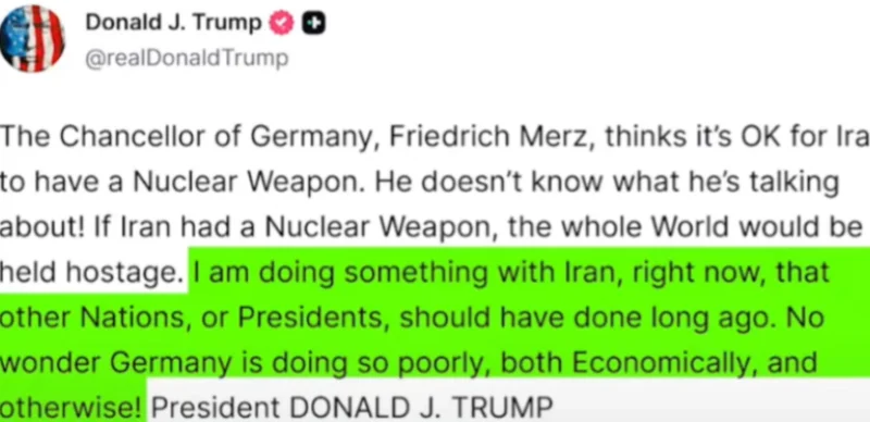 ล่าสุด ประธานาธิบดี โดนัลด์ ทรัมป์ แห่งสหรัฐฯ ได้ออกมาตอบโต้นายกรัฐมนตรีเยอรมนีผ่าน ทรูธ โซเชียล ว่า “ฟรีดริช แมร์ซ” นายกรัฐมนตรีเยอรมนี คิดว่าการที่อิหร่านมีอาวุธนิวเคลียร์นั้นจะไม่เป็นปัญหา ซึ่งเขาขาดความเข้าใจ ถ้าอิหร่านมีอาวุธนิวเคลียร์ โลกทั้งใบก็จะตกอยู่ในภาวะวิกฤต และตอนนี้ผมกำลังดำเนินการบางอย่างกับอิหร่านอยู่ ซึ่งเป็นสิ่งที่ประเทศอื่น ๆ หรือประธานาธิบดีคนอื่น ๆ ควรทำมานานแล้ว แต่ก็ไม่น่าแปลกใจที่เยอรมนีตกต่ำทั้งทางด้านเศรษฐกิจและด้านอื่น ๆ