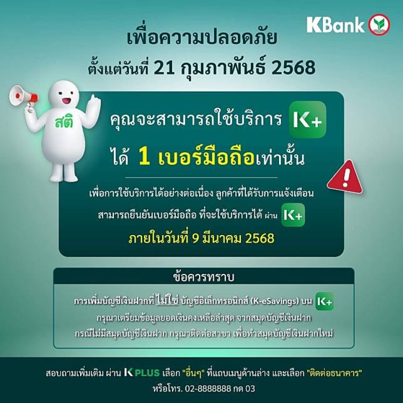 ธนาคารกสิกรไทย ประกาศผ่านเพจเฟสสบุ๊ก KBank Live ว่า เพื่อความปลอดภัย ตั้งแต่วันที่ 21 กุมภาพันธ์ 2568 ลูกค้า K PLUS จะสามารถใช้บริการได้ 1 เบอร์มือถือเท่านั้น