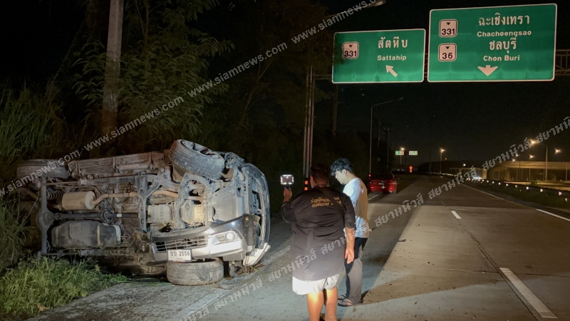 เมื่อเวลา 22.30 น. วันที่ 16 พฤษภาคม 2568 พ.ต.ท. ประกาศิต พลเดช สารวัตรสอบสวน สภ.ห้วยใหญ่ จ.ชลบุรี รับแจ้งเหตุรถยนต์พลิกคว่ำ บนถนนหลวงแผ่นดินหมายเลข 36 บายพาสชลบุรี–ระยอง ฝั่งขาเข้าสัตหีบ ต.ห้วยใหญ่ อ.บางละมุง จ.ชลบุรี หลังรับแจ้งจึงประสานเจ้าหน้าที่กู้ภัยสว่างบริบูรณ์ธรรมสถานเมืองพัทยาเข้าตรวจสอบ