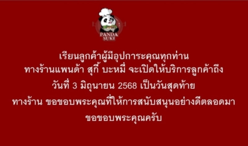 เมื่อวันที่ 31 พฤษภาคม 2568 ที่ผ่านมา เพจเฟซบุ๊ก แพนด้า สุกี้ เรสเทอรอง Panda Suki Restaurant ซึ่งเป็นร้านสุกี้ชื่อดังย่านพระราม 5 ได้โพสต์ประกาศว่า ร้านแพนด้า สุกี้ บะหมี่ จะเปิดให้บริการวันสุดท้ายวันที่ 3 มิถุนายน 2568 ขอบคุณทุกการสนับสนุน