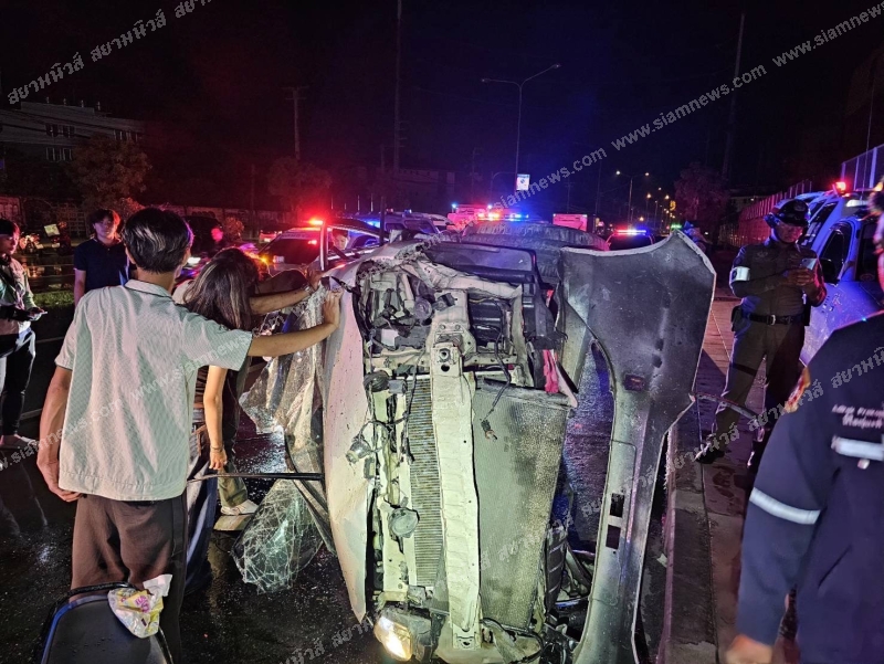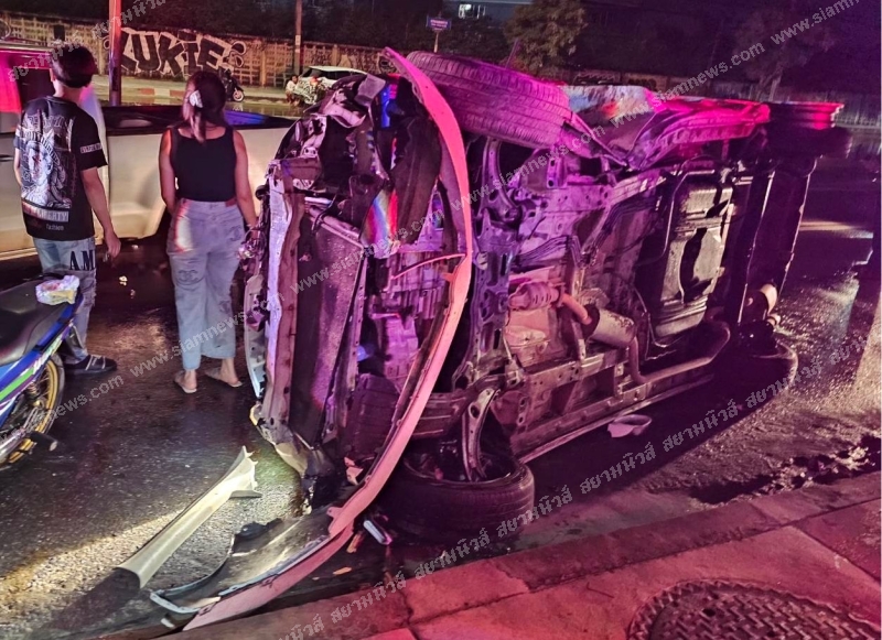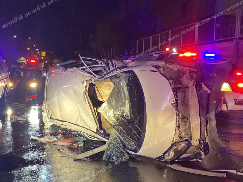 วัยรุ่นไปสังสรรค์  ขับฮอนด้าพุ่งชนเกาะกลางเหินข้ามฟากถนนฉลองกรุง รถพลิกคว่ำเพื่อนเจ็บ 3 ดับสลด 2 ราย
