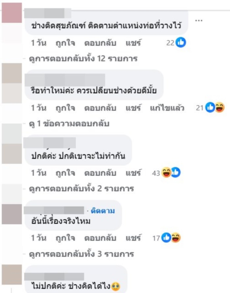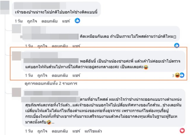 ภายหลังจากที่โพสต์ดังกล่าวเผยแพร่ออกไป ชาวเน็ตจำนวนมากต่างเข้ามาแสดงความคิดเห็นไปในทิศทางเดียวกันว่า ไม่ปกติ พร้อมตั้งข้อสงสัยว่าการบรีฟงานกับช่างเป็นอย่างไร ช่างถึงได้ติดตั้งออกมาในลักษณะนี้ ทางเจ้าของโพสต์ก็ยืนยันว่านี่คือของจริงที่ถูกติดตั้งจริง ๆ และได้สั่งให้รื้อถอนแล้วทันที เพราะไม่สามารถใช้งานได้จริง โดยให้เหตุผลเพิ่มเติมว่า พอดีอันนี้เป็นบ้านน้องชายค่ะพี่ แล้วเค้าไม่ค่อยเข้าไปตรวจ แค่บอกให้หันส้วมไปทางนี้ ไม่คิดว่าจะอยู่ตรงกลางอะค่ะ เป็นลมเลยค่ะ