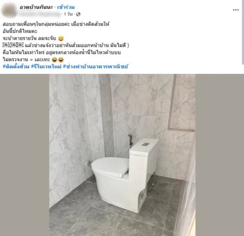 เจ้าของโพสต์ได้อธิบายถึงที่มาที่ไปของเหตุการณ์สุดพีกนี้ว่า สอบถามเพื่อน ๆ ในกลุ่มหน่อยค่ะ เมื่อช่างติดส้วมให้ อันนี้ปกติไหมคะ จะบ้าตายรายวัน ลมจะจับ (แล้วช่างแจ้งว่าอย่าหันส้วมออกหน้าบ้าน มันไม่ดี) คือไม่หันไม่เท่าไหร่ อยู่ตรงกลางห้องน้ำนี่ไม่ไหวค้าบบบ ไม่ตรวจงาน = เละเทะ #ติดตั้งส้วม #รีโนเวทใหม่ #ช่างทำบ้านอาคารพาณิชย์